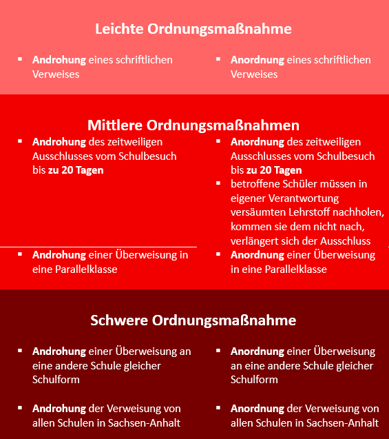Da uns natürlich bewusst ist, dass es gerade Heranwachsenden nicht immer gelingt, Regeln des Alltags einzuhalten, möchten wir mit diesem Leitfaden aufzeigen, wie wir kraft der gültigen Gesetze und Erlasse des Landes Sachsen-Anhalt einerseits unterstützen sowie andererseits erziehen und sanktionieren müssen, wenn dies erforderlich wird. Bei Fehlverhalten stehen zunächst Erziehungsmittel[1] zur Verfügung: